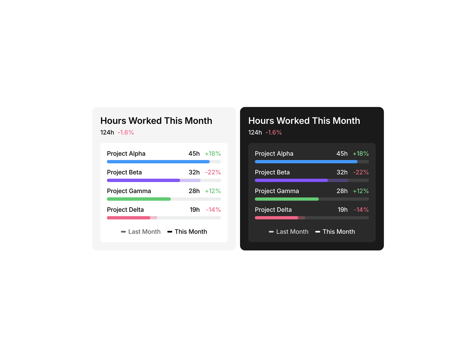 Show total hours and project breakdowns with ease. Four themes, fully customizable layouts and colors, flexible component for any design.